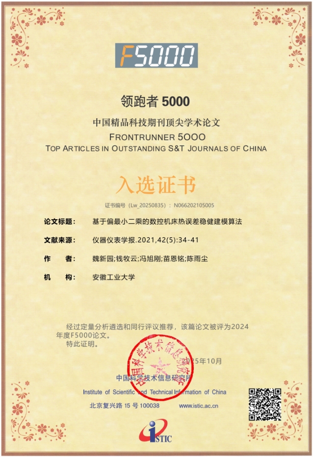 青年博士教师魏新园、钱牧云等发表在《仪器仪表学报》上的学术论文“基于偏最小二乘的数控机床热误差稳健建模算法”成功入选。