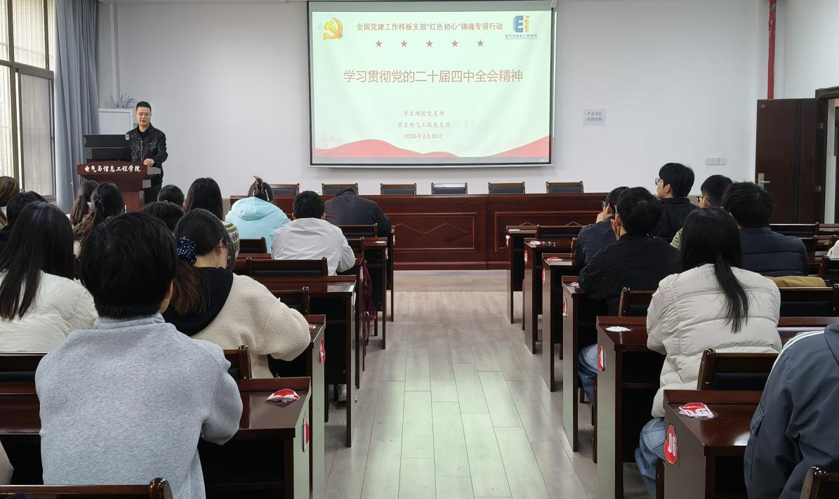 学生测控党支部与学生电气工程党支部在电气楼113教室联合开展学习贯彻党的二十届四中全会精神专题党课。本次党课由学生电气工程党支部书记蒋安东主持,学生测控党支部书记杨恒基主讲,两个支部全体党员参加学习。